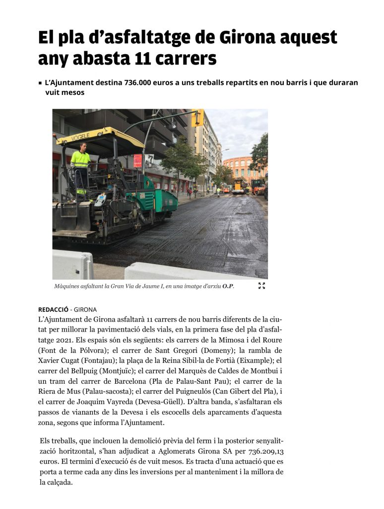 L’Ajuntament de Girona asfaltarà onze carrers de nou barris diferents de la ciutat per millorar la pavimentació dels vials. Aquests vials són: els carrers de la Mimosa i del Roure -Font de la Pólvora-, el carrer de Sant Gregori -Domeny-, la rambla Xavier Cugat -Fontajau, la plaça de la Reina Sibil·la de Fortià -Eixample-, el carrer de Bellpuig -Montjuïc-, el carrer de Caldes de Montbui i un tram del carrer de Barcelona -Pla de Palau-Sant Pau-, el carrer de la Riera de Mus -Palau-sacosta-, el carrer del Puig Neulós -Can Gibert del Pla-, i el carrer de Joaquim Vayreda -Devesa-Güell-.