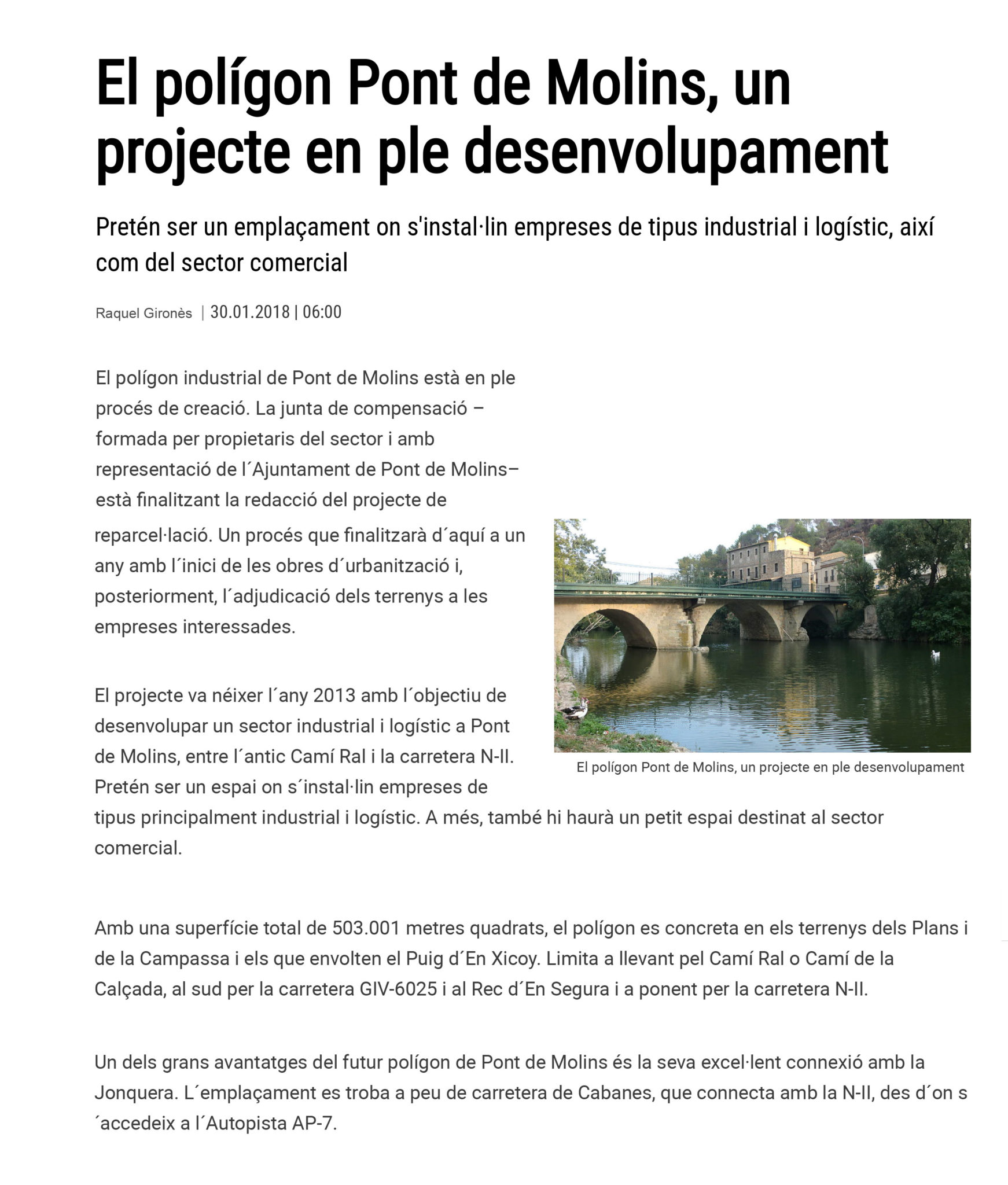 TECPLAN treballa en la redacció del projecte del polígon de Pont de Molins. El sector industrial i logístic a desenvolupar es troba entre l’antic Camí Ral i la carretera N-II, amb una superfície total de 503.001 metres quadrats, amb gran connexió també amb l’AP-7.