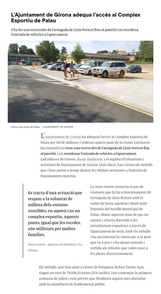 Els treballs, amb un cost aproximat de 80.000 euros consisteixen en la pavimentació de la vorera i el gual d’entrada i sortida de vehicles de l’aparcament. Les obres es preveuen finalitzar durant aquest mes d’octubre.